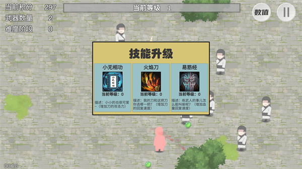 鸠摩智转刀游戏最新版中玩家作为小说人物鸠摩智登场,并以击杀小怪和BOSS进行升级为主要玩法,每次升级都会获得随机技能,技能名字也非常的还原小说,,例如武功秘籍小无相功、控鹤功、凌波微步、火焰刀等等,更是添加了不少的趣味性。而且没有任何广告信息,玩家可以畅快游玩。