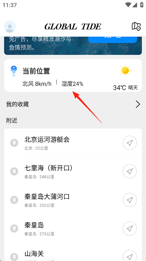 1、打开全球潮汐APP,在首页先定位你所在的位置或想要了解的位置;