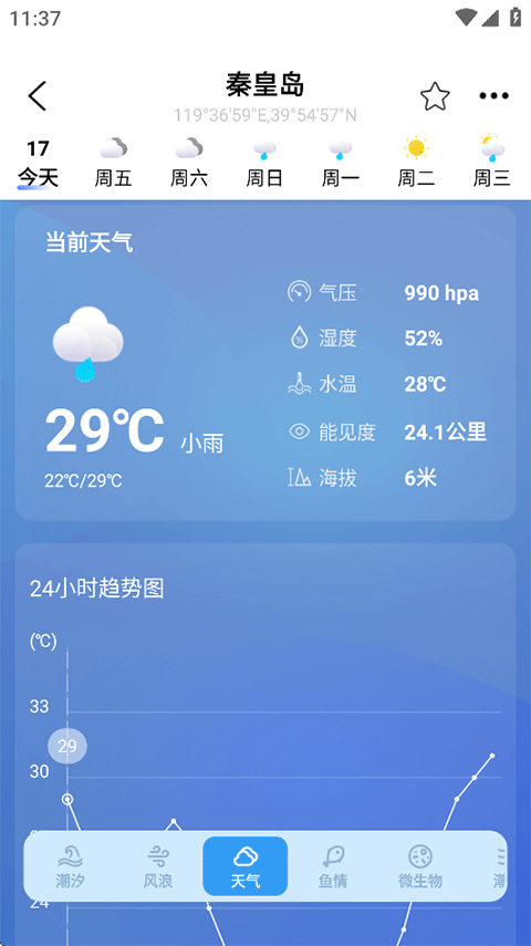 提供每小时天气、风浪预报及鱼类活动分析,结合30天水温变化趋势,科学判断最佳钓鱼、潜水与冲浪时机。