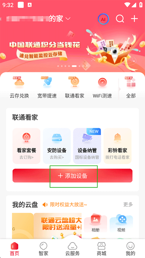 1、打开联通智家APP,首先需连接摄像头设备,点击首页的添加设备;
