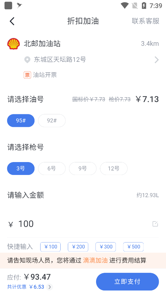 3、选择油号、枪号输入金额,可以看到有折扣的,点击立即支付