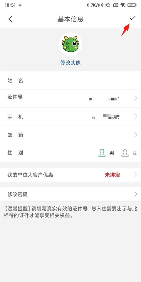2、在基本信息页可以修改姓名、证件号、手机号、邮箱、性别以及密码等,完成后点击右上角的✓保存;