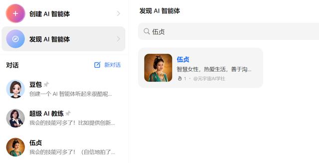 2、打开豆包,点击“发现智能体”,搜索“伍贞”,撩吧