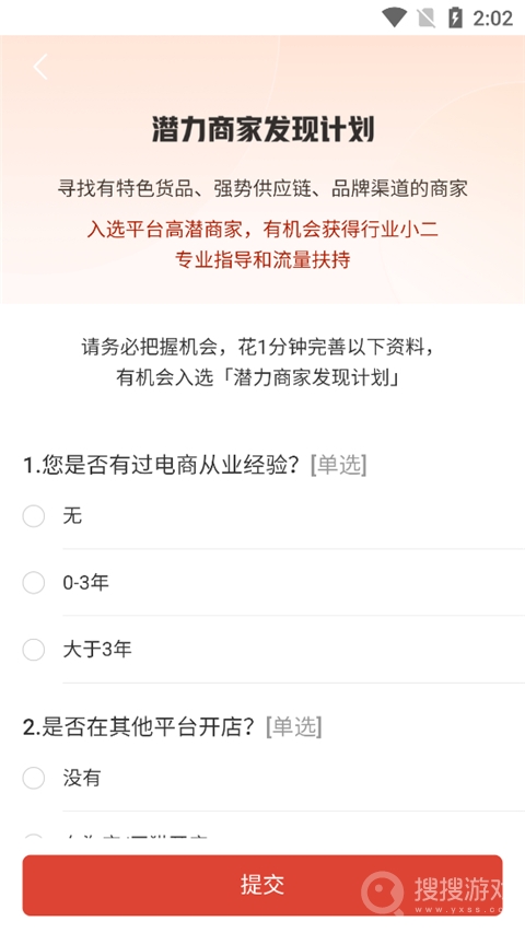 3、进入平台后,点击完善下面的资料,如有无从业经营、是否在其他平台开店、年经营规模、前期投入人数等等问题。最后点击提交即可;