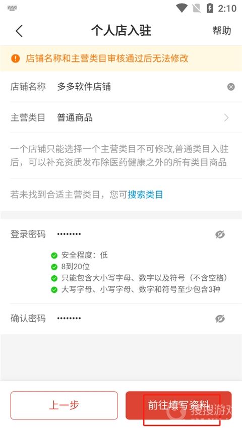 5、输入店铺名称,选择主营类目,需要注意的,一个店铺智能选择一个主营类目,不可修改,然后输入登录密码,选择填写资料;